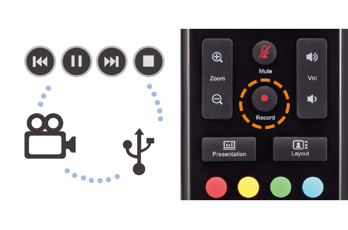 Записывайте свои видео-конференции – видео, аудио и файлы для обмена – непосредственно на флэш-накопитель USB, формируя, таким образом, видеоархивы, которые помогут вам избежать потери информации после завершения совещания. Воспроизводите записанные совещания непосредственно с помощью системы EVC900 или на своем компьютере или ноутбуке, используя ПО VCPlayer от AVer.